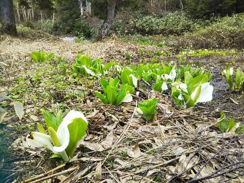 一昨日の天元台高原、夏山営業に向けロープウエイ、リフトの整備中ですが、歩きで第二リフト降り場まで、タケノコの出ている状況とか、まだ残るコシアブラ、タラの芽採り、そして高山植物を観に登りました、昨年もこの時期に観にいくミズバショウ・・第二リフト降りて右に少し行くと”ホワイト”という休憩所があり、その少し上のところにミズバショウが群生しています。標高の低いふもとの低山では5月連休頃見頃ですが、天元台は標高が高いので6月に入ってからです・・昨年より今年は遅いようです、まだこれからという感じでした咲いております・・
