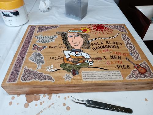中三の頃フォークソングが流行りだし、ハモニカ吹いて引き語りする吉田拓郎に憧れた・・そしてビートルズのサウンドにも心奪われた・・何とか自分でも弾きたくてギターにハモニカ、そしてホルダーも欲しいと思うようになる・・小遣いだけでは心もとなく・・中学卒業の春休み、父に頼んで仕入れ先の牛乳屋さんで初のアルバイトをしました、団子作りに近所へ団子配達、お店の留守番などもしましたね、そして手に入れたギターにホルダ、ハモニカ一本(この一本はいまでも残っている)、長井市で買いましたね、高校の3年間は夢中で練習・・でも都会に就職し最初の1年は同期と3人集まり寮でやっていたが、フォークブームも去り、同期に彼女ができ寮を出たりと、自然にギターもやらなくなった、あれから40年、定年を迎え・・また青春時代が懐かしく、還暦60と同時に知人からギターを買い、また弾き始めた、気が付けば・・今は、一番の癒し、心安らぐ時間が弾き語りとなる、ハーモニカで歌うスタイルが一番好きで、ハモニカも各キー毎に必要なんで8本集まった、そして月一回、新月に開かれる、川西町ブルームでの新月ライブに行くようになる・・持ち運びのときハモニカや小物がバラバラでは不便で先月、ハモニカケースを作ったものの、さらにハモニカホルダやカポ、チューナー、ピックも袋に入れると中はぐちゃぐちゃになり不便で、まとめて持ち運びできるケースを作った。おもてのイラストは高校の頃、描き残していたイラストを使用した・・当時のスケッチブックが一冊残っているのです、オリジナルイラストでなく何かの雑誌のイラスト模写だったと思う・・