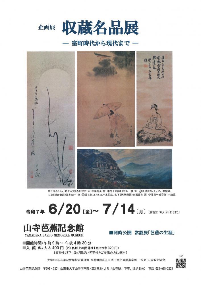 企画展「収蔵名品展 −室町時代から現代まで−」会期:令和7年6月20日(金)〜7月14日(月)    (休館日:6月25日) 山寺芭蕉記念館の収蔵品より「はるもやゝ」(森川許六 画・松尾芭蕉 賛)、「蟻通図」(英一蝶 筆)をはじめとする名品を選び公開します。 芭蕉の書や山(山に丸)長谷川コレクション、穎原退蔵・尾原仂コレクションなどから俳文学や歴史資料の名品を、また注目すべき絵画作品を選りすぐって展示します。文学的、美術的価値の高い作品を是非ご覧ください。