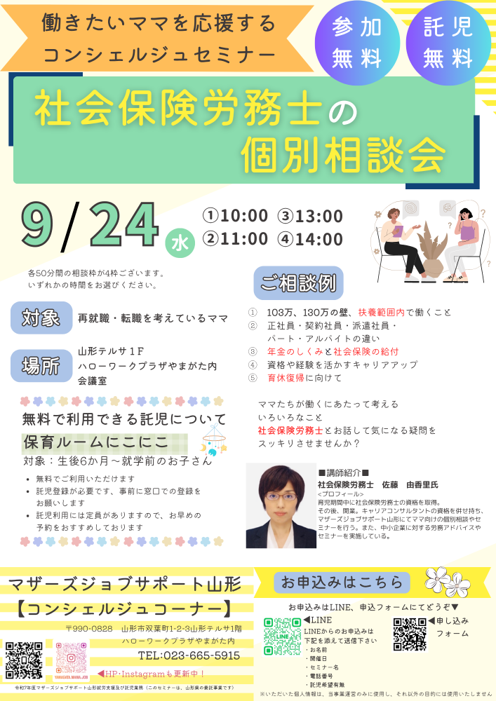 マザーズジョブサポート山形【コンシェルジュコーナー】では社会保険労務士による個別相談会を開催しております。◇:*:☆:*:◇:*:☆:*:◇:*:☆:*:◇:*:☆:*:◇@ 103万、130万の壁ってなに?A 扶養の範囲ってどういうこと?B 年金と保険料の仕組みって?C 正社員とパート、どう違うの?D 資格を活かしたキャリアアップって? こんな疑問を解決しませんか?ご相談は、お一人50分間。ご相談料は無料です。ご相談中の託児もご利用いただけます。これから働き始めるうえで知っておきたい基礎知識、損にならない働き方、相談してみませんか?現在、ご自身も子育て中の社会保険労務士 佐藤由香里先生がやさしいママ目線で、ご相談をお受けします!お気軽にお問合せくださいね。 □お問い合わせ□マザーズジョブサポート山形【コンシェルジュコーナー】◇電話でのお申込み→023-665-5915◇お申込みメール→コチラ◇LINEでのお申込み→トーク画面にて・お名前・お申込み講座・託児の有無・お電話番号を送信してください。返信をもって申込完了となります。↓公式LINE追加はこちら↓☆メール・LINE・電話での対応は 開庁日のみとなります。 メール、LINEは開庁時間内で 返信いたします。
