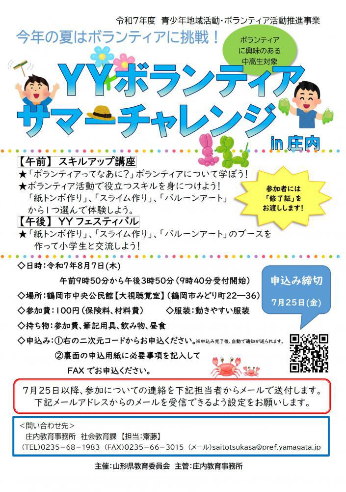 チラシ・要項は上記PDFをダウンロードください↑ 今年の夏はボランティアに挑戦しよう!「YYボランティア サマーチャレンジ in 庄内」を開催します! 中学生・高校生を対象に、午前中はスキルアップ講座でボランティアの基礎を学び、午後は『YYフェスティバル』で小学生と楽しく交流しましょう! 紙トンボ作りやスライム作り、バルーンアートなど、楽しいプログラムが盛りだくさんです。 【日時】令和7年8月7日(木)9:50〜15:50 【場所】鶴岡市中央公民館(大視聴覚室) 【参加費】100円(保険料・材料費) 【対象】中学生・高校生および青少年ボランティアサークル会員 【申込締切】7月25日(金)まで 【申込方法】二次元コードまたはFAX(0235-66-3015)でお申し込みください。 夏休みの思い出づくりと地域貢献が一度にできるチャンスです!みなさんのご参加をお待ちしています♪ 【お問い合わせ・申込先】  庄内教育事務所 社会教育課 (担当:齋藤) TEL: 0235-68-1983  FAX: 0235-66-3015