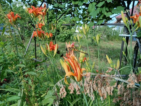 我が家の姫ヒオウギスイセンが咲いています、漢字で(姫檜扇水仙)・・鮮やかなオレンジ色の花を咲かせる南アフリカ原産の球根植物。日本には観賞植物として渡来し、現在は野生化したものがよく見られます。強健で乾燥に強く、丈夫で増えやすい植物です。冬は休眠しますが、植えっぱなしで管理でき、ほとんど手がかかりません。私にはちょうどいい・・今朝、写真を撮ろうとしたら・・トンボがとまりました・・一昨日から涼しい毎日・今朝もそんなに熱くなかった・・梅雨はどうしたのだろうか・・