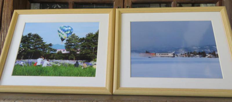 次に紹介するのは松永政和さんの作品です。左は「いっせいにパチリ」。アヤメ祭りで上げられた熱気球とサクラ号が配置されている。そのどっしりとした構図の手前でカメラを構えている人たちの姿に、思わずほっこりしてしまいます。松永さんらしいユニークな視点が楽しめる作品です。 右は「雪煙を上げて」。米屋こうじさんはこの作品に対して、「雪原と冬空のコントラストが面白い。」と感想を語っていました。先の作品とは異なり登場人物(?)は松永さんだけ。松永さんはただ一人で雪原に立って、シャッターチャンスを待っていたのでしょうか。作品を創ることは大変なことなのだと、改めて教えられる作品である。