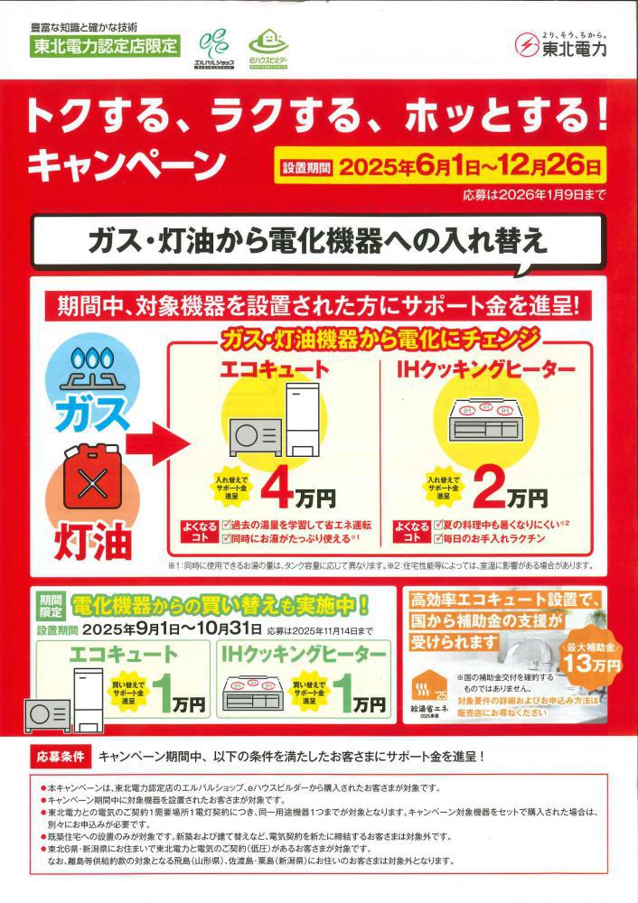 現在東北電力で行われているトクする、ラクする、ホッとする!キャンペーンですが、追加で買い替えキャンペーンが始まります!エコキュートIHクッキングヒーターの買い替えも対象になります。9月1日〜10月31日設置の期間に限り電化製品からの買い替えが対象となっておりますのでご注意下さい。是非お得なキャンペーンを活用してみて下さい(^^)/