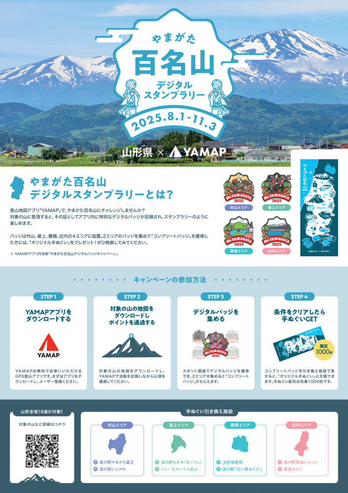 【2025年版】YAMAPやまがた百名山スタンプラリー完全ガイド|限定手ぬぐい&ラ・フランスが当たるWチャンスも! body { font-family: 'M PLUS Rounded 1c', sans-serif; background-color: #f4f9f4 !important; /* 自然をイメージした薄い緑 */ color: #333; font-size: 16px; line-height: 1.8; margin: 0; padding: 20px 5%; } a { color: #2E7D32; /* テーマカラーの緑 */ text-decoration: none; font-weight: bold; } a:hover { text-decoration: underline; opacity: 0.8; } .section-fade { opacity: 0; transform: translateY(20px); transition: opacity 0.8s ease-out, transform 0.8s ease-out; } .section-fade.visible { opacity: 1; transform: translateY(0); } .related-card { transition: transform 0.3s ease, box-shadow 0.3s ease; } .related-card:hover { transform: translateY(-5px); box-shadow: 0 8px 20px rgba(0,0,0,0.15) !important; } { "@context": "https://schema.org", "@graph": [ { "@type": "Article", "mainEntityOfPage": { "@type": "WebPage", "@id": "https://yamagata-kouiki.info/log/?l=HYAKUMEIZAN2025" }, "headline": "【2025年版】YAMAPやまがた百名山デジタルスタンプラリー完全ガイド|限定手ぬぐい&ラ・フランスが当たるWチャンスも!", "description": "2025年開催!YAMAP連動「やまがた百名山デジタルスタンプラリー」の完全攻略ガイド。限定手ぬぐいの貰い方、村山エリアの対象山(蔵王・月山他)や景品交換所、さらにラ・フランスが当たるWチャンスまで徹底解説!", "image": "https://i.ibb.co/hM8h6V3/yamagata-hyakumeizan-ogp.jpg", "author": { "@type": "Organization", "name": "山形県のほっぺtourism" }, "publisher": { "@type": "Organization", "name": "山形県のほっぺtourism", "logo": { "@type": "ImageObject", "url": "https://yamagata-kouiki.info/wp/wp-content/themes/yamagata-kouiki/images/ogp.jpg" } }, "datePublished": "2025-08-01T10:00:00+09:00", "dateModified": "2025-08-01T10:00:00+09:00" }, { "@type": "Event", "name": "やまがた百名山デジタルスタンプラリー", "startDate": "2025-08-01", "endDate": "2025-11-03", "eventStatus": "https://schema.org/EventScheduled", "eventAttendanceMode": "https://schema.org/MixedEventAttendanceMode", "location": [ { "@type": "Place", "name": "村山エリアの対象山(蔵王山、月山、葉山、甑岳)", "address": { "@type": "PostalAddress", "addressRegion": "山形県 村山地域", "addressCountry": "JP" } }, { "@type": "Place", "name": "最上エリアの対象山", "address": { "@type": "PostalAddress", "addressRegion": "山形県 最上地域", "addressCountry": "JP" } }, { "@type": "Place", "name": "置賜エリアの対象山", "address": { "@type": "PostalAddress", "addressRegion": "山形県 置賜地域", "addressCountry": "JP" } }, { "@type": "Place", "name": "庄内エリアの対象山", "address": { "@type": "PostalAddress", "addressRegion": "山形県 庄内地域", "addressCountry": "JP" } } ], "description": "登山アプリ「YAMAP」を使い、やまがた百名山の対象座を巡るデジタルスタンプラリー。2地域以上登ると限定手ぬぐいを、活動日記投稿で抽選でラ・フランスをプレゼント。", "organizer": { "@type": "Organization", "name": "山形県" }, "offers": { "@type": "Offer", "name": "スタンプラリー参加", "price": "0", "priceCurrency": "JPY", "availability": "https://schema.org/InStock", "url": "https://yamap.com/magazine/66396" }, "subEvent": { "@type": "Event", "name": "活動日記投稿でフルーツが当たるダブルチャンスキャンペーン", "description": "ハッシュタグ「#やまがた百名山」をつけて、下山後の温泉やグルメ情報を含む活動日記を投稿すると、抽選で5名様にラ・フランスをプレゼント。", "startDate": "2025-08-01", "endDate": "2025-11-03", "eventAttendanceMode": "https://schema.org/OnlineEventAttendanceMode", "location": { "@type": "VirtualLocation", "url": "https://yamap.com/magazine/66396" } } }, { "@type": "FAQPage", "mainEntity": [ { "@type": "Question", "name": "スタンプラリーへの参加は無料ですか?", "acceptedAnswer": { "@type": "Answer", "text": "はい、スタンプラリーへの参加は無料です。登山アプリ「YAMAP」の無料会員でもご参加いただけます。ただし、登山にかかる交通費や装備、アプリの通信料などはご自身の負担となります。" } }, { "@type": "Question", "name": "どうすればデジタルバッジを獲得できますか?", "acceptedAnswer": { "@type": "Answer", "text": "YAMAPアプリで対象の山の地図をダウンロードし、活動記録を取りながら山頂などの指定ランドマークを通過すると、自動的にデジタルバッジが付与されます。" } }, { "@type": "Question", "name": "村山地域で景品の「手ぬぐい」はどこで交換できますか?", "acceptedAnswer": { "@type": "Answer", "text": "村山地域では「道の駅やまがた蔵王」と「道の駅にしかわ」で交換できます。交換の際は、YAMAPアプリで獲得した「コンプリートバッジ」画面を窓口でご提示ください。訪問前に公式サイトで最新情報や営業時間をご確認ください。" } }, { "@type": "Question", "name": "ダブルチャンスのラ・フランスプレゼントに応募するには?", "acceptedAnswer": { "@type": "Answer", "text": "下山後に楽しんだ温泉、グルメ、観光地などの情報と、ハッシュタグ「#やまがた百名山」をつけてYAMAPで活動日記を公開投稿するだけで応募完了です。素敵な投稿をお待ちしています!" } } ] } ] } document.addEventListener("DOMContentLoaded", () => { const sections = document.querySelectorAll(".section-fade"); const observer = new IntersectionObserver( entries => { entries.forEach(entry => { if (entry.isIntersecting) { entry.target.classList.add("visible"); observer.un