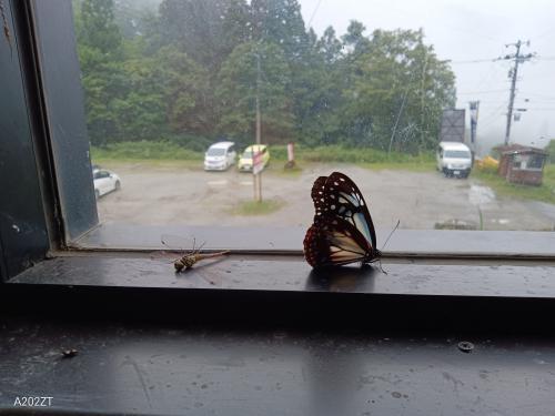 昨日8月10日朝、天元台高原湯元駅(920m)駅舎内・・あいにくの雨で客足がぽつりぽつり・・そこに2匹のアサギマダラが舞い込む・・外は雨、気温も低い・・動きが悪くなって雨宿りかなと・・外出すのもまだ早いとしばらくそっとしておいた・・アサギマダラの隣は舞い込んだトンボが一匹・・すでに亡くなっている・・なんか詩でもかけそうな雰囲気・・そこで”さでさだまさし”の”雨やどり”思い出す・・雨宿りとは、急な降雨などの時に雨具などを持っていないために、軒下などで雨がやむのを待つこと。である・・詩は・・”それはまだ私が神様を信じなかった頃 9月のとある木曜日に雨が降りまして こんな日に素敵な彼が現れないかと 思ったところへあなたが雨やどり”で始まる雨宿りで出会った男性に恋をしてしまった女性の、彼との偶然の再会、そしてその偶然を話し家族に笑われ・・本当なら連れて来いと、リクエストに応え家族へ自身たっぷりに紹介したらば彼の靴下に穴がポカリ・・そしていきなりのプロポーズに気を失い、最後のオチは『あなたの腕に雨宿り』という・・1977年の曲 あぁー私が20歳の頃・・懐かしい