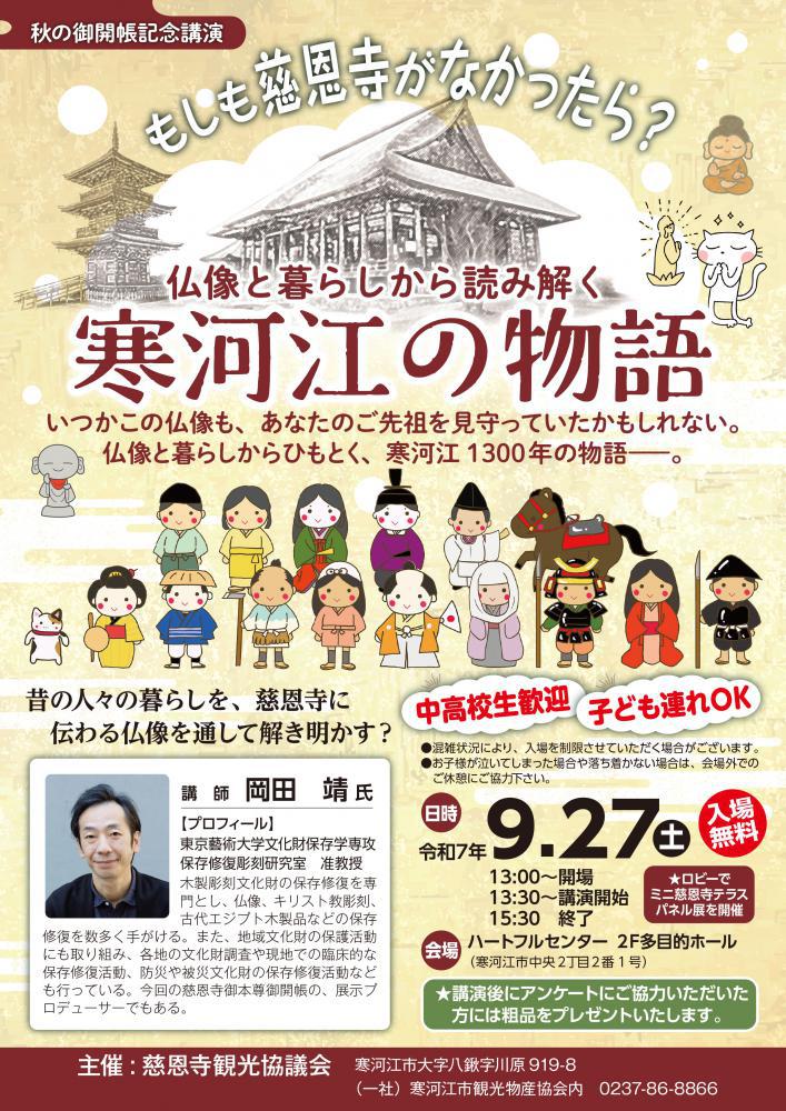 秋の御開帳記念講演「仏像と暮らしから読み解く寒河江の物語」を開催します。講師には、東京藝術大学文化財保存学専攻保存修復彫刻研究室准教授の岡田靖氏をお迎えします。仏像と暮らしからひも解く、寒河江1300年の物語を深く掘り下げてお話しいただきます。ぜひこの機会にご参加ください。日時:令和7年 9月27日(土) 13時30分〜15時30分会場:ハートフルセンター 2F多目的ホール