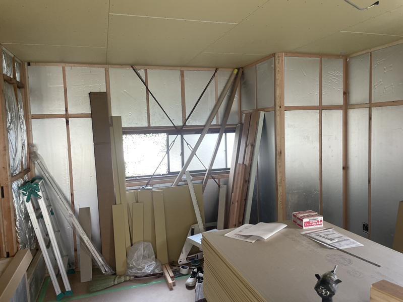 みなさんこんにちは。八月も残り少なくなり、日が暮れるのも早くなってきたなと感じるのですが、暑さだけは変わらずですね。前回紹介した改装工事の続きになりますが、畳だった真壁造りの部屋を大壁仕様に。床はフローリング敷きにする為、既存の畳を撤去しました。床の高さを下地材で調整し、その間に断熱材をいれていきます。畳は熱伝導率の低い素材でできています。それ自体が断熱性能を備えているので、フローリングに変える場合はそれに代わる断熱材が必要になります。土間収納の壁には断熱材が入っていいなかった為、薄くても高性能な断熱パネルを内側から施工してあります。仕切り壁を部分撤去し、段差がある通路部分にはステップを設けました。次回には完成を紹介できるよう注力してまいります。
