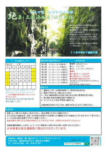 ボートでしか行けない秘境・三淵渓谷を巡る船旅9月の運航日程が決定しました。 運航日程は9月6,7、13、14、20、21、27、28日となります。 暦の上では秋となっておりますが、記録的な少雨と暑さが続いております。水を近くに感じながらひんやりとした渓谷内の空気を「肌で楽しむ夏の三淵渓谷」を是非体験しませんか?まだまだ日差しもキツく気温も高い日が多いので、帽子や飲み物等の熱中症対策や虫除け対策の準備もお願いいたします。 合地沢湖面広場の災害復旧工事のため原則土曜日と日曜日の運航のみとなります。 参加料個人プラン大人 4,000円子供 2,000円(小学生まで) 全便相席となります。お席の指定はできません。 貸切プラン6人乗りボート 22,000円4人乗りボート 14,000円10名様まで 36,000円貸切の予約から個人料金への変更はできません。 ダム湖の水位や道路状況、気象状況等によって運航を中止になる場合がございます。 お問い合わせ/ご予約野川まなび館(0238-87-0605)※水曜日は休館日のため受付できません。