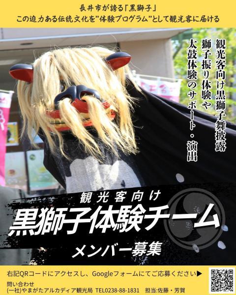 “観光客向け”黒獅子体験チームメンバー募集長井市が誇る「黒獅子」この迫力ある伝統文化を“体験プログラム”として、観光客に届ける「黒獅子体験チーム」メンバーを募集します。  ■□ 問い合わせ □■   (一社)やまがたアルカディア観光局 (88)1831 メール:info@arcadia-kanko.jp 担当:佐藤・芳賀  観光文化交流課(82)8017 ●活動内容 観光客向け黒獅子舞の披露、獅子振り体験や太鼓体験のサポート・演出●こんな人を歓迎します 地元の伝統を広めたい人人と関わること、盛り上げることが好きな人 観光・文化体験に興味がある人 もちろん黒獅子舞経験者も大歓迎!●募集要項 年齢制限:18歳以上 経験の有無:問わない(未経験者歓迎/経験者は即戦力として活躍可能) 男女の別:問わない●活動頻度・資金 稽古は月1回程度、獅子振りの披露は令和8年度以降に本格稼働。  稽古会場費、最初に準備する衣装などに係る経費は(一社)やまがたアルカディア観光局で負担。●応募方法 Googleフォームにてご応募ください!応募はこちらから 観光客の笑顔と驚きに出会える、やりがいのある活動です。 まずはお気軽にご応募・お問い合わせください! お問い合わせ(一社)やまがたアルカディア観光局 0238-88-1831 担当:佐藤・芳賀  観光文化交流課0238-82-8017