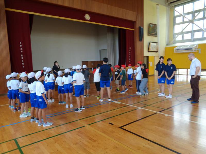 北中生3名による職場体験も、本日が最終日となりました。中間休みに体育館をのぞいてみると…。北中生が担当している2、3、5年生が、一緒にドッチボールをしようと準備をしていました。そこへALTのM先生も加わり、大人数でのドッチボールが始まりました。学年によって力の差はもちろんありますが、そこは手加減もしながら楽しくやれたようです。続いての時間に各教室に行ってみると、5年生は社会科、3年生は図画工作、そして1年生は体育。調べ学習にアドバイスをしてくれたり、一緒に作品作りに挑戦したり、マット運動の補助をしてくれたりと、大活躍の中学生でした。ちなみに、昨日の帰り際に「くたびれませんか?」と聞いてみてとこと、「くたびれます!」との即答。いろいろ気を遣って対応してくださっているからこそですね。3日間、ほんとうにおつかれさまでした。中学校でも頑張ってくださいね。