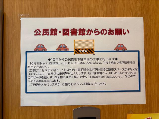 10月1日より地下駐車場の工事が行われます。地下駐車場がご利用いただけない日があります。(午後5時までご利用いただけませんが、夜間はご利用いただけます。)また、ご利用いただける日でも駐車スペースが少なくなっています。地下駐車場をご利用の際は、いつもよりスピードを落としていただき、小さなお子様とは手を繋いで歩いていただきますようお願いいたします。ご不便をおかけしますが、ご協力のほどよろしくお願いいたします。