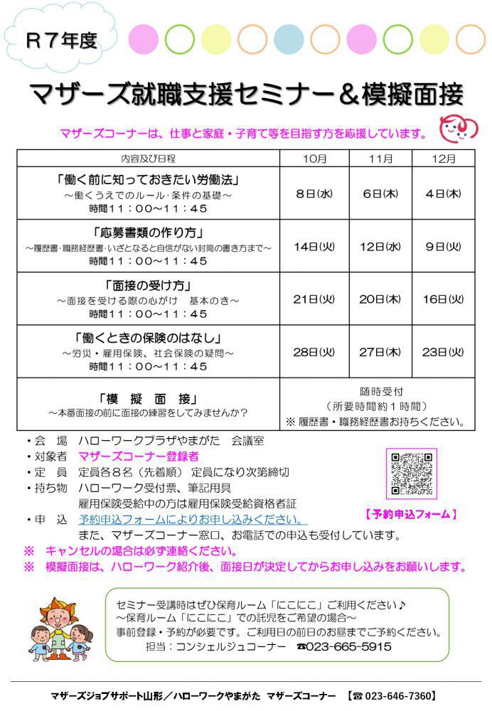 2025年、10月、11月、12月のマザーズ就職支援セミナー と模擬面接 のお知らせです! 【マザーズ就職支援セミナー】マザーズコーナー(ハローワーク)のスタッフが、毎月4つのテーマでご説明します。 ★『働く前に知っておきたい労働法』「賃金支払いのルールって?」「社会保険や雇用保険の加入条件は?」「育休は正社員じゃなくても取れる?」etc.求人票の項目に沿って、基本的なことをご説明します。【日時】10月8日(水)11月6日(木)12月4日(木) ★『応募書類の作り方』履歴書・職務経歴書・添え状…書き方に不安はありませんか?基本的な記載方法からマザーズ向けの好事例など分かり易くご説明します。【日時】10月14日(火)11月12日(水)12月9日(火) ★『面接の受け方』「書類は通るけど面接が…」や「面接は苦手…」と思われている方基本的なマナーや面接の流れを説明いたします。短時間ですが、参加された皆さんと一緒に入室・退室も練習予定です。【日時】10月21日(火)11月20日(木)12月16日(火) ★『働くときの保険のはなし』雇用保険、社会保険(健康保険、厚生年金)を加入する基準とは?よく耳にする「扶養の範囲内」で働くとどうなるの?働くときの保険について、基本的なことをご説明します。【日時】10月28日(火)11月27日(木)12月23日(火) ◎ 会場はいずれも ハローワークプラザやまがた内 会議室◎ 時間はいずれも 11:00〜11:45◎ 託児:無料(事前予約が必要)◎ 定員:8名(先着順)◎申込み方法: マザーズコーナー窓口、または お電話でお申込みください※キャンセルの場合も 事前にご連絡ください。◎持ち物:ハローワーク受付票、筆記用具※雇用保険受給中の方は 雇用保険受給資格者証 【マザーズ模擬面接】スーツ着用で臨んでいただく本番面接を想定した面接です。ご希望の日時で事前にご予約ください。◎会場 ハローワークプラザやまがた内 会議室◎託児 無料(事前予約が必要)◎持ち物 ハローワーク受付票、筆記用具 履歴書の写 ※雇用保険受給中の方は 雇用保険受給資格者証 お問い合わせはハローワークプラザやまがたTEL:023-646-7360 託児ご利用の方はマザーズジョブサポート山形【コンシェルジュコーナー】までお問合せくださいTEL:023-665-5915