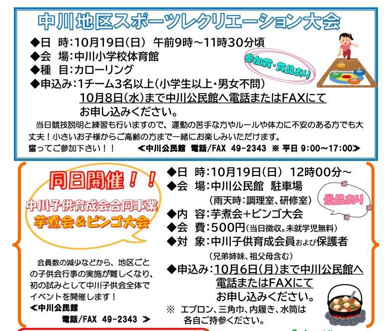 公民館だよりでも募集をしておりましたが、10月19日(日)開催の、『中川地区スポーツレクリエーション大会』(旧中川小学校体育館)と、『中川地区子供育成会合同事業 芋煮会&ビンゴ大会』(中川公民館)の参加者を募集しております!!スポレク大会は昨年好評だったカローリングを行います。地区対抗ではございませんので、お友達やご家族とお誘いあわせの上、奮ってご参加ください☆芋煮会&ビンゴ大会は、中川地区子供育成会の全体行事として初めての試みです。時間も12:00〜受付と、スポレク大会後にご参加いただける日程となっておりますので、カローリングで汗を流した後は、美味しい芋煮とビンゴ大会で盛り上がりましょう(^^♪(スポレク大会は参加無料ですが、芋煮会はお一人500円を当日徴収いたします。できるだけつり銭のないようご協力をお願いいたします)<公民館だより「なかがわ」(9月16日号)はコチラ>→公民館だより 9月16日号:中川公民館日記