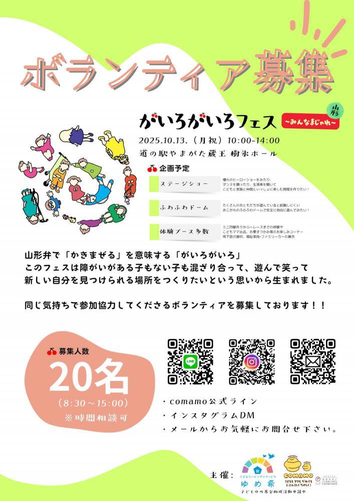 山形弁で「かきまぜる」を意味する「がいろがいろ」このフェスは障がいがある子もない子も混ざり合って、遊んで笑って新しい自分を見つけられる場所を作りたいという思いから生まれました。同じ気持ちで参加協力してくださるボランティアを募集しております!!【日時】 令和7年10月13日(月・祝)8:30〜15:00 ※時間相談可 【場所】 道の駅やまがた蔵王 樹氷ホール 【人数】 20名【申込】 チラシ記載のQRコードからお願いします。 詳細は上記PDFをご覧ください↑