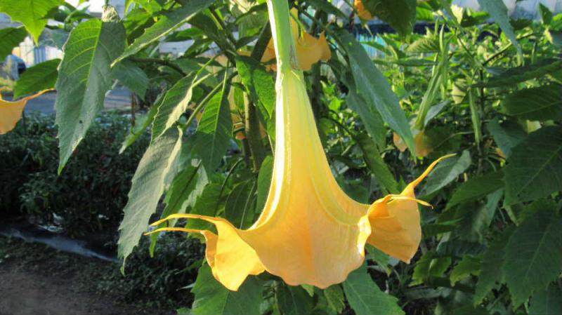 ●今年も散歩中に垂れ下がって下向きに咲いている「キダチチョウセンアサガオ」に出会いました ラッパのような形の花びらの先端は五つに分かれ反り返っていますがなかなか下から花を撮るのが大変です 蕾もたくさんついておりこれからたくさんの花を咲かせてくれる花です この植物は有毒ですが薬草として使われることもあるそうです 江戸末期の華岡青洲が使った麻酔薬はチョウセンアサガオから精製したのだそうです