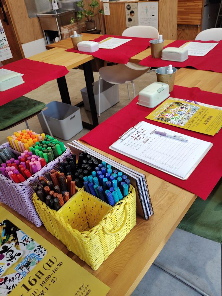 以前、中川公民館でも教えていただいたという、筆ペン絵文字〜凜〜の金子先生に、筆ペン絵文字を教えていただきました。たまたま、友人に誘われて参加したのですが、中川公民館でも数回教えていただいていたとのことで、不思議なご縁を感じています(*・ω・人・ω・*)可愛らしい字体で、先生はスラスラとお手本を書いてくださいますが……難しいっ!!力の加減が絶妙で、手首もうまく使えないし、まぁるい可愛らしい字になりませんっ(>_