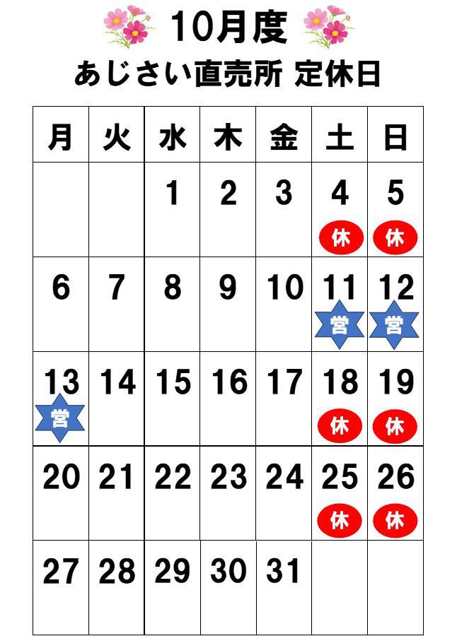 あじさい営農組合です!あじさい直売所の定休日をお知らせします。第1週、3週、4週の土日はお休みです。11日(土)、12日(日)、13日(祝)は営業いたします。平日のご来店が難しい方は、この機会にぜひご来店いただき新米・悪戸いもをお求めいただければ幸いです。