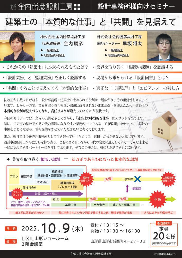 弊社は設計事務所として設計・監理業務、そして第三者としての検査業務を行う中で、住宅業界には大きな課題が存在することを実感してまいりました。その経験を踏まえて、新築・リノベーションの「設計」のみならず、「地盤解析」「構造最適化」「品質監理」を組み合せ、東北エリアのビルダー様を総合的にサポートしております。今年4月の法改正から数か月が経ち、設計者の皆様におかれましても、建築士に課せられる責任とリスクの大きさを改めて課題と感じていらっしゃるのではないでしょうか。弊社では2年以上前から、この法改正により想定される変化を予測し、準備を重ね、実際の案件を通じて有効性を検証しながら対策を積み上げてまいりました。その中で見えてきたのが、「建築士の本質的な仕事とは何か」という問いであり、それをしっかりと実践できれば、設計事務所として生き残るだけでなく、同じ設計者として共に歩む力となる、という確信でした。このたびのセミナーでは、弊社が培ってきた経験やノウハウを皆様にご紹介し、共有させていただきたいと存じます。ぜひこの機会にご参加賜り、直接お会いできることを楽しみにしております。