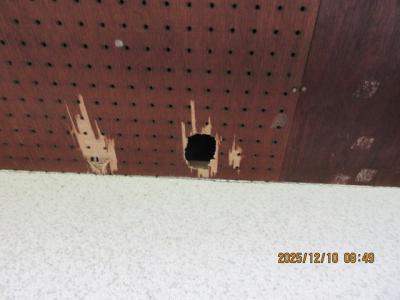 こんにちは。松田です。今日は軒天にカケスから穴を開けられたので、何とかしてほしい。との依頼があり、訪問しました。確認してみると、軒天板に穴があいています。施主様は、音はコツコツを聞こえてはいたそうですが、まさか・・・こんな大きな穴が2ヶ所あり、びっくりしたそうです。軒天板を交換して、塗装をすれば完成です。