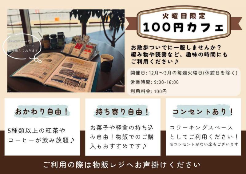 12月から3月までの期間、毎週火曜日限定で「100円カフェ」がスタート!お散歩のついでや、自分だけの趣味の時間を楽しむ場所、みんなで集まってお茶飲みをする場所として、気軽に立ち寄ってみませんか? 冬期限定!火曜日は「100円カフェ」へ 開催日:12月〜3月の毎週火曜日 (休館日の第2火曜日を除く) 営業時間:9:00 〜 16:00 利用料金:100円 ここが嬉しい!100円カフェの魅力 おかわり自由!5種類以上の紅茶やコーヒーがなんと飲み放題!その日の気分に合わせて、いろいろな味をじっくり楽しめます。 持ち寄り自由!お菓子や軽食の持ち込みOK!テラス内の物販コーナーで気になるお菓子を購入して、その場でお楽しみいただくのもおすすめです。 コンセントあり!コワーキングスペースとしても利用可能。PC作業や読書、編み物などの趣味の時間にも最適です。※コンセントがない席もございます。 一口メモ「ここでは慈恩寺国史跡指定総合広報誌『慈恩寺Times』のバックナンバーも読めます。温かいコーヒーを片手に、慈恩寺の歴史や地域の魅力を深掘りできます。史跡登録までの道のりや慈恩寺テラス開館までの軌跡も知ることが出来ます。利用する際は、まず物販レジのスタッフに『100円カフェ利用です!』とお声がけください♪」 施設情報 スポット名 慈恩寺テラス 住所 山形県寒河江市大字慈恩寺1178-1 Googleマップで見る 電話番号 0237-84-6811 公式サイト 慈恩寺テラス 公式HP よくある質問 予約は必要ですか? 予約は不要です。当日、物販レジにて受付を行ってください。 時間は無制限ですか? 営業時間(9:00〜16:00)内であれば、ごゆっくりお過ごしいただけます。.aikiji_honbun a:hover { opacity: 0.8; text-decoration: none !important; }details summary::-webkit-details-marker { display: none; }{ "@context": "https://schema.org", "@graph": [ { "@type": "Event", "name": "慈恩寺テラス 100円カフェ", "description": "12月〜3月の毎週火曜日限定で開催される100円カフェ。コーヒー・紅茶が飲み放題で、持ち込みも自由な憩いのスペースです。", "startDate": "2024-12-01T09:00", "endDate": "2025-03-31T16:00", "eventAttendanceMode": "https://schema.org/OfflineEventAttendanceMode", "eventStatus": "https://schema.org/EventScheduled", "location": { "@type": "Place", "name": "慈恩寺テラス", "address": { "@type": "PostalAddress", "streetAddress": "大字慈恩寺1178-1", "addressLocality": "寒河江市", "addressRegion": "山形県", "postalCode": "991-0011", "addressCountry": "JP" } }, "offers": { "@type": "Offer", "price": "100", "priceCurrency": "JPY", "availability": "https://schema.org/InStock" } }, { "@type": "Article", "headline": "【寒河江市】慈恩寺テラスで「100円カフェ」開催中!", "description": "山形県寒河江市の慈恩寺テラスで冬期限定開催の100円カフェ情報を紹介。", "author": { "@type": "Organization", "name": "山形県のほっぺtourism" } }, { "@type": "FAQPage", "mainEntity": [ { "@type": "Question", "name": "予約は必要ですか?", "acceptedAnswer": { "@type": "Answer", "text": "予約は不要です。当日、物販レジにて受付を行ってください。" } }, { "@type": "Question", "name": "時間は無制限ですか?", "acceptedAnswer": { "@type": "Answer", "text": "営業時間(9:00〜16:00)内であれば、ごゆっくりお過ごしいただけます。" } } ] } ]}