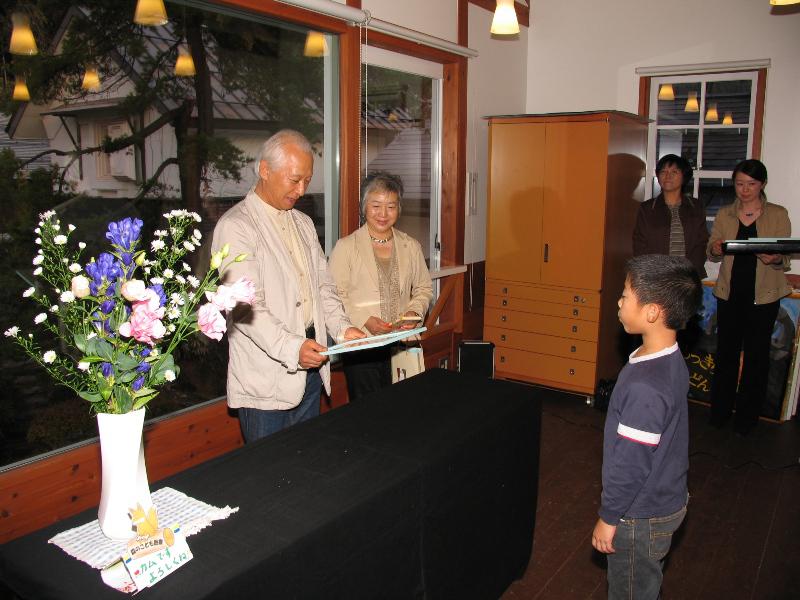 『カム』の名付け親の小野晃広君、いっぱい本を読んでくれた小野 樹さん、家族でたくさん森図書を利用してくれた石田ファミリーにささやかなプレゼントを準備させていただきました。