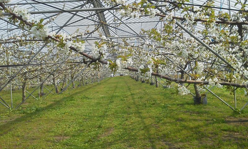 さくらんぼの花は殆ど紅がなく、遠目から見ると白地にグレーがかったような色合いになります。