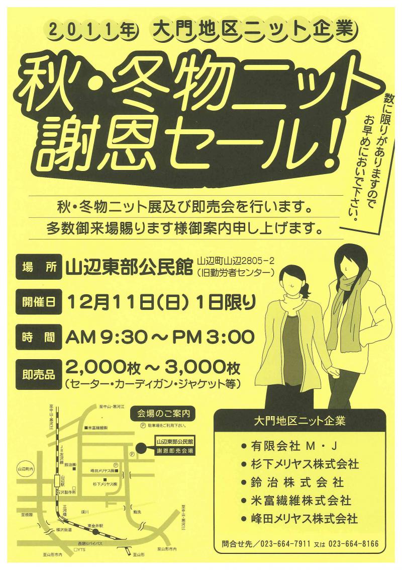 毎年恒例となっている、大門地区ニット企業5社によるニット企業秋・冬物ニット謝恩セールが12月11日(日)に1日だけ開催されます。