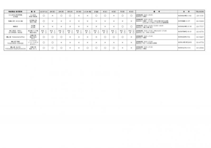 令和7年 年末〜令和8年 年始にかけて米沢観光コンベンション協会会員の米沢市内飲食店、観光施設、お土産品ほか年末年始の営業情報を掲載いたします。年末年始に米沢に来られるお客様、帰省されるお客様ぜひご活用いただきたいと存じます。PDFファイルもございます。印刷してぜひご活用ください。※米沢観光コンベンション協会会員に年末年始の営業情報の提供をお願いし回答いただいた施設のみ掲載しております。