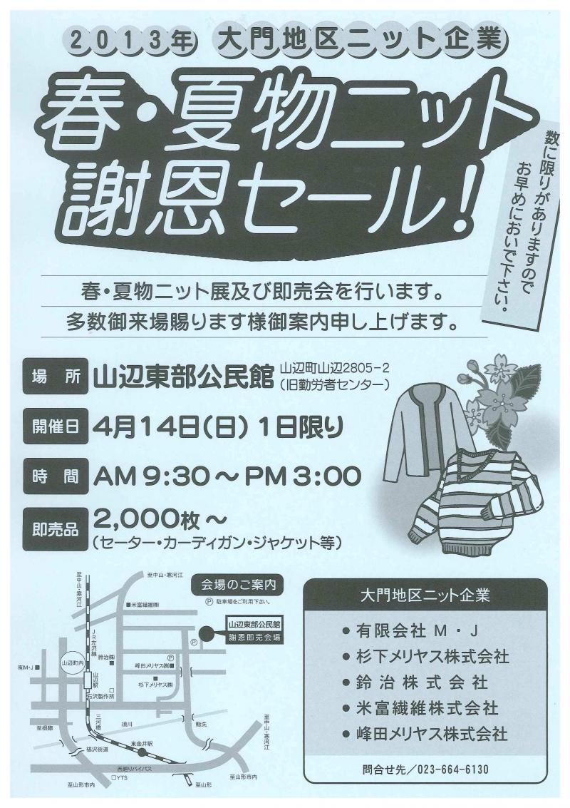 毎年恒例の大門地区ニット企業5社による春・夏物ニット謝恩セールが4月14日(日)に1日だけ開催されます。