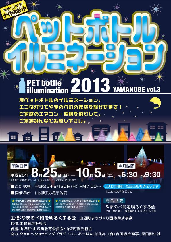 今回で3回目を迎えるペットボトルイルミネーション。今年は更にパワーアップして山辺の夜空を灯します。■開催期間 8月25日(日)〜10月5日(土)■点灯時間 18:30〜21:30■点 灯 式 8月25日(日) 19:00〜■会 場 山辺町役場前駐車場付近■そ の 他  点灯式当日は、わたあめ・ポップコーンのプレゼント有り(無くなり次第終了)また、作業をお手伝いをしてくれるボランティアスタッフ&ペットボトルイルミネーションを製作してくれるグループ・企業を募集しております。ひと夏の思い出を一緒につくりませんか?お気軽にお問合せください。【作業日時】 8月18日(日)、8月24日(土)、8月25日(日)午前9時に山辺町役場庁舎前に集合ください。(3日間の内の一部のみ参加も大歓迎!!)【問合せ先】 山辺町を明るくする会 代表 鈴木謙一 TEL090-2792-5096 前回2012年の様子 [仙英学園 ゆりかご幼稚園]作品(2012)