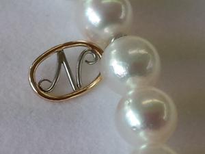 花珠真珠のネックレスにはゴールドのイニシャルが。