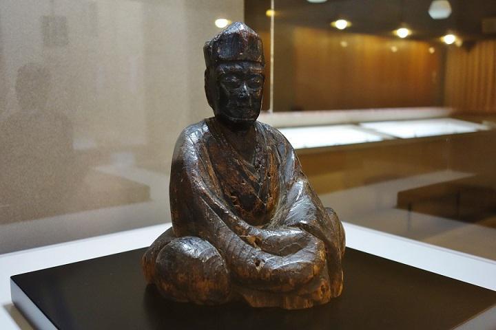 開催中の展覧会「江戸絵画と芭蕉」は、芭蕉が酒田を訪れた期間(7月29・30日、8月3〜9日)に合わせた記念展で、酒田に遺る唯一の芭蕉の遺墨《玉志亭唱和懐紙》(県指定文化財)の公開が目玉となっています。 しかし、芭蕉の遺墨だけではなく、大変貴重で伝来もとても興味深いものも展示されています。 それがこの《木彫芭蕉像》です!この像は『芭蕉庵の庭前の柳の木で門弟が師を偲んで彫ったものであり、仏頂和尚の遺偈とともに庵の什物であったが、門流の違和に際して流出した』と伝わっています。美濃派の神谷玄武坊が所有していましたが、天明五年に酒田を訪れた際に仏頂和尚の遺偈とともに武長百合坊が譲り受け、現在は本間美術館に収蔵されています。いかにも武家出身らしい肩をはった厳しい表情で、風雅に徹した崇高な風貌を伝えています。黒光りしているのは長年に渡り像の前で香が焚かれていたからで、俳諧の祖として芭蕉が祀れていたことが分かります。 芭蕉の遺墨とともに、この機会にぜひご覧ください。