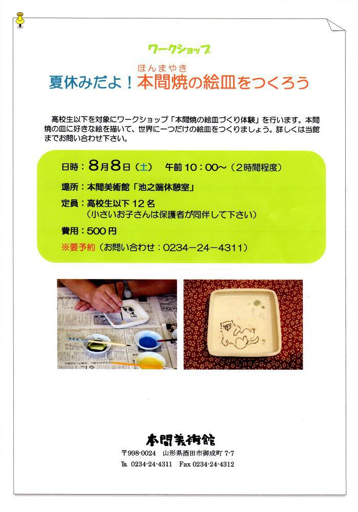 夏休みも半分が過ぎようとしていますね。本間美術館では、夏休み中のイベントとしてワークショップ「夏休みだよ!本間焼の絵皿をつくろう」を企画しています。(明後日、8日です!) 今回は子ども限定で企画したのですが…まだまだ定員に達していません(+_+)そこで急きょ、子どもも大人も大歓迎ということになりました。料金もいつもよりお安くなってます(^^ゞ夏休みの思い出づくりに参加してみませんか?ぜひご予約下さい!!