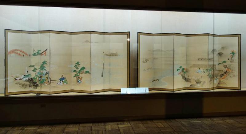 開催中の企画展「市中山居の茶 −伝来の茶道具−」では、秋の特別公開として3点の伝来の屏風絵を公開しています。 特別公開その1 米沢藩上杉家伝来「高嵩谷筆 須磨・住吉図屏風」 江戸時代後期(酒田市指定文化財) この屏風絵は、『源氏物語』の「須磨」「明石」「澪標」の三つの話を描いています。右隻は、都から須磨に流謫された光源氏が、茅屋の假住居で秋を迎える場面「須磨」を描き、小舟で明石にいる想いを寄せる娘のところに通う話「明石」までを表しています。左隻は、都に呼びもどされた光源氏が、都にいた子息と共に住吉神社に御礼に参詣する場面です。画面右上には、ちょうど船で住吉詣に現れた明石で別れた娘(明石の君)が描かれています。しかし、明石の君はあまりに立派な源氏の一行を見て、同じ源氏の子どもでも自分の娘は明石でわびしく暮らしていることにいたたまれなくなり、船を遠ざけてしまいました。画面右下に白鷺のとまる船の水路を示すための杭が描かれており、これを「澪標」と言います。 寛政九年(1797)三月、本間家三代・光丘は米沢藩への功績から、九代藩主・上杉治憲(鷹山)より、御染筆(自筆の書)と高嵩谷筆御屏風(展示作品)、御菓子を拝領しました。  この機会にぜひご覧ください。