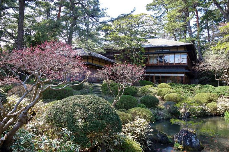 まだ雪の残る頃に始まった「雛祭古典人形展」も、会期が残り10日となりました。その間に季節は移り変わり、庭園内も春の装いとなっています。  一番早く開花したのは白梅です。日当たりのよい池の東側にあり、毎年一番はこの梅ですね(^^)  この白梅は満開を迎えており、そろそろ散り始める気配です。代わって池の中島にある紅梅が、蕾を紅く膨らませ開花を待っています。 遠目にも枝が紅くなっているのがわかりますね|д゚) そして忘れてならいのは、清遠閣入口前にある白梅の古木。毎年花をつけるか心配しながらも、今年も可憐な花を咲かせてくれました。 空気が澄んで晴れた日には、借景の鳥海山も真っ白な姿を見せてくれます。   あずま屋の傍にそびえる赤松の巨木は、樹齢が300年を超えると言われています。  春の日差しを浴びながら散策するのは、とても気持ちが良いですよ。日本庭園らしい、清楚でつつましやかな小さい春を探してみて下さい。