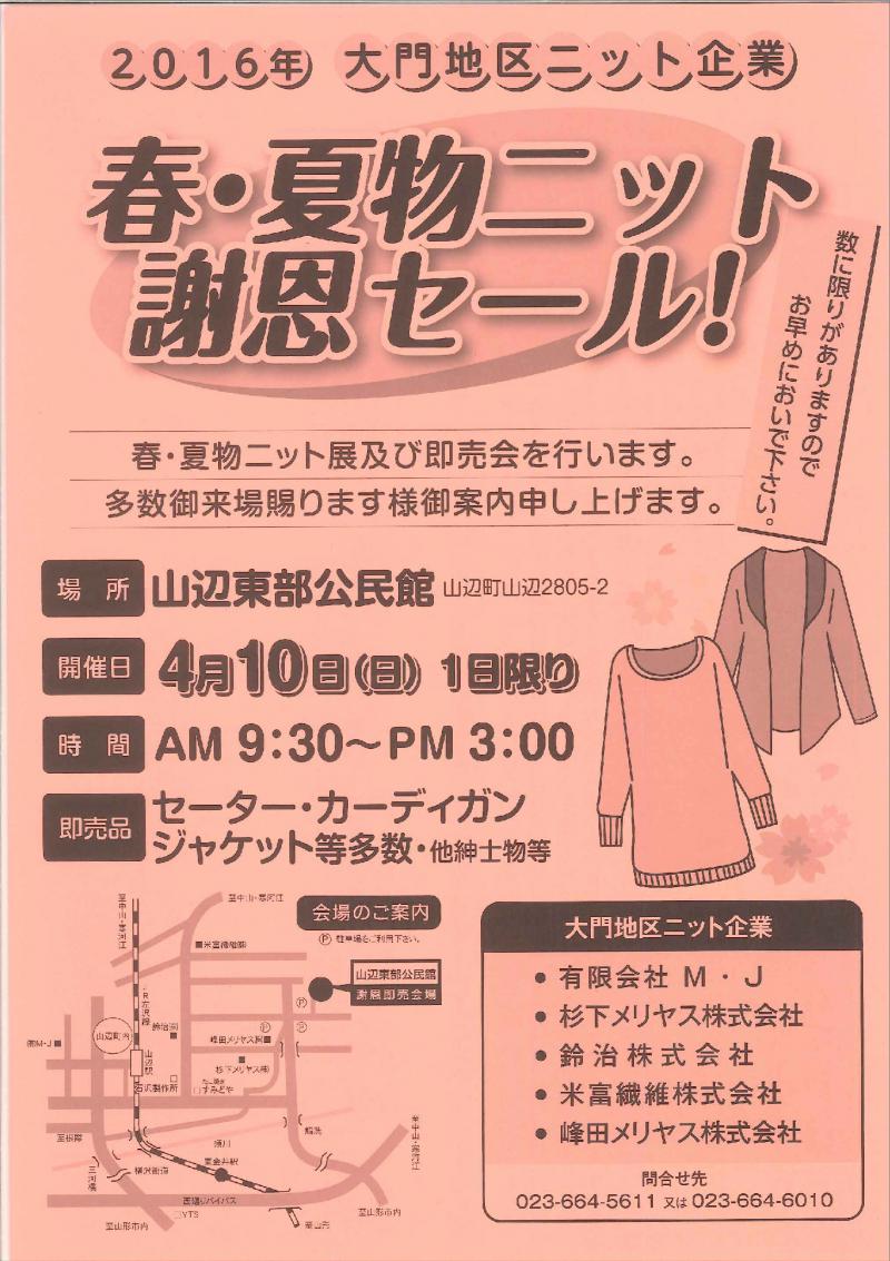 毎年恒例の大門地区ニット企業5社による春・夏物ニット謝恩セールが4月10日(日)に1日だけ開催されます。