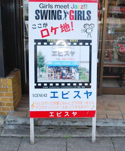 2004年公開の映画スイングガールズ、田舎の落ちこぼれ女子高校生がおりなす青春映画、ビッグバンドを組んで、ジャズを演奏する「ジャズやるべ!」、ロケは故郷置賜地方を中心に行われ、セリフも山形弁(置賜弁)上野樹里さん、貫地谷 しほりさん、平岡 祐太さん、本仮屋ユイカ他メンバー、公開から10年以上たつ、いまでもたまに熱烈ファンはロケ地めぐりしてる人がいるそうだ、たまたまアンティークな小物探しで見つけたお店、映画では鈴木友子がPS2とiMacを売り払って中古サックスを買った質屋さんで登場、ディスカウントショップ『エビスヤ』米沢市中央3-8-35、自分好みの花入れなどがあるので今回3回目の来店、心ときめいた中に手の大きさくらいのスクーターのミニカーガあったがこれは売らないらしい、残念!!、他にほしいなと思ったミニカーがあるがちょっと高い、売れるといけないから何かは秘密。。いろいろお店の主人と話していたら、米沢市内のロケ地マップを頂いた、こうなると順次紹介せざるを得ないな・ぶらぶらとまずは米沢のロケ地から散策がてら紹介していきます。お店の中に撮影風景など樹里ちゃんの写真があるが10年前とあまりかわっていないな・・
