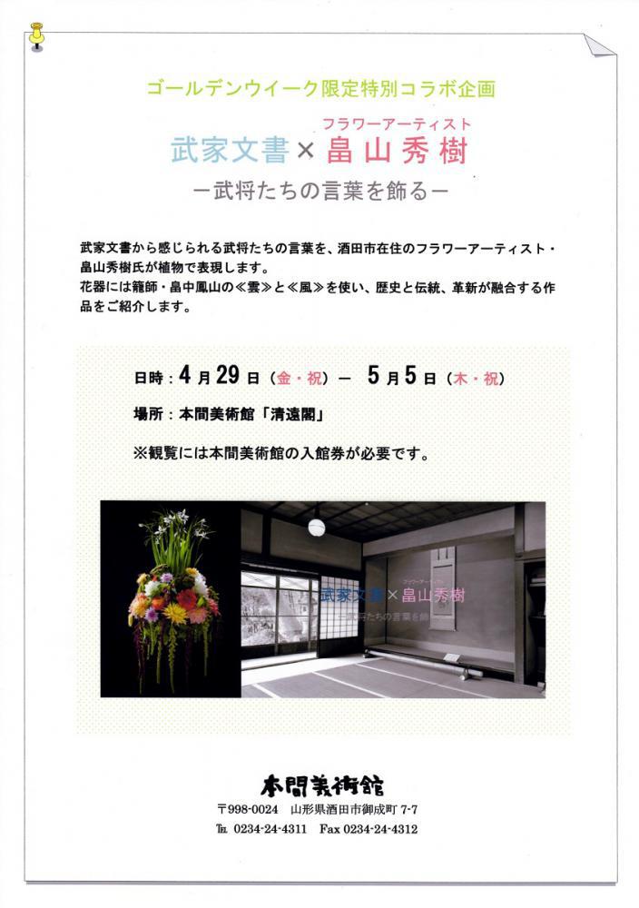 本間美術館ではゴールデンウイーク中のイベントとして、ゴールデンウイーク限定特別コラボ企画「武家文書×畠山秀樹 ー武将たちの言葉を飾る−」を開催します!酒田市在住のフラワーアーティスト・畠山秀樹氏(ロータスガーデン主宰)が、清遠閣で開催中の常設展示「武家文書を中心に」からインスピレーションを受けた作品を、一階・二階の床の間に展示します。 どんなコラボレーションがみれるのか、今から楽しみです(^_-)-☆ぜひお越しください。