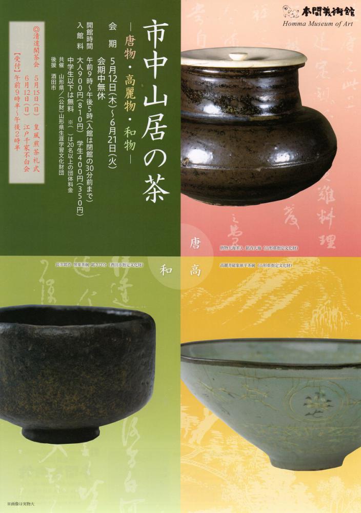本日より企画展「市中山居の茶ー唐物・高麗物・和物ー」が始まりました。 本展の見どころは、@本間家が庄内藩主酒井侯から拝領した全国に誇る名品を展示。A国指定の≪重要美術品・大井戸茶碗≫を始め、県指定の≪割高台茶碗≫≪高麗青磁象嵌平茶碗≫≪唐物大海茶入≫≪古瀬戸平茶碗≫、市指定の≪長次郎作 黒楽茶碗≫など、指定文化財を多数展示。B個人蔵の利休の手紙、≪千利休 消息 古田織部宛≫を展示。C茶道具を『唐物・高麗物・和物』に分類することは、『唐物→高麗物→和物』という茶道の歴史を表すことにつながり、そこから見えてくる美意識の変化を感じてもらいたい。 となっております。本間家が財政支援の御礼として庄内藩や米沢藩などから拝領した由緒ある伝来の品を中心に、唐物・高麗物・和物に分類してご紹介します。中国由来の喫茶の文化が日本人の心に触れ茶道へと変わる。その美意識を形にする茶道具を、眼と心でご鑑賞下さい。
