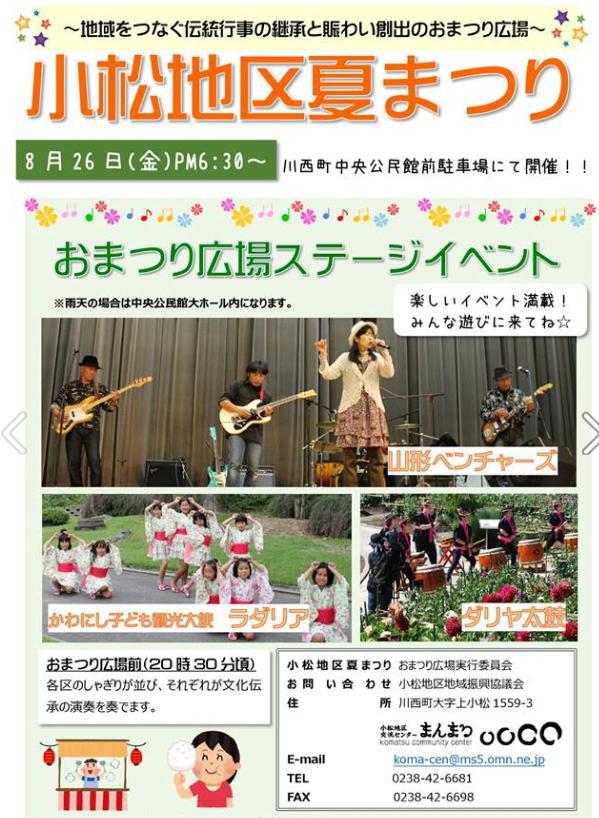 【8月26日は小松地区夏まつり!!】川西夏まつりが終わったばかりですが、2週間後には『小松地区夏まつり』があります!ステージイベントでは、山形ベンチャーズさん、かわにし子ども観光大使ラダリアさん、ダリヤ太鼓さんの華麗なパフォーマンスが楽しめます!様々な屋台も出ます(^^)/小松地区交流センターまんまるでも生ビールと玉コンを販売いたします!おまつり後半では迫力ある商宮律(しゃぎり)を目の前で楽しめます♪みなさま、是非お越しください〜☆彡