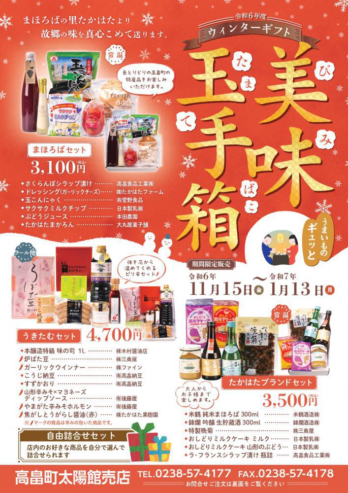 ↑お申込み用紙はこちらから 令和6年度 ウィンターギフト             うまいものギュッと 『美味玉手箱』「期間限定販売!」 令和6年11月15日(金)〜令和6年1月13日(月)お歳暮・お年始に高畠の美味しいものがギュッと詰まったギフトはいかがですか。遠く離れた大切な方へ、いつもお世話になっている方へ、自分へのご褒美に…まほろばの里たかはたより、故郷の味を真心こめて送ります!今年の一押しは、寒い冬に体を芯から温めてくれるピリ辛の商品を揃えた「うきたむセット」どのセットも高畠町の企業の商品を詰め合わせたココ「太陽館売店」でしか買えないギフトですので、ぜひお買い求めください♪お問い合わせ、ご注文は≫≫高畠町太陽館売店       TEL:0238‐57‐4177/FAX:0238‐57‐4178  お問合せフォームはこちらから道の駅たかはた(観光案内所)  TEL:0238‐52‐5433/FAX:0238‐52‐5055