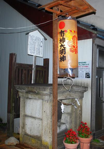 『上小松は上杉藩政時代より山形県南部の経済の中心であった。新潟方面や最上川を利用した江戸大阪との取引などが、小松においても盛んに行われていた。とりわけ、小松の馬市は全国的に有名であった。この市神は、商業の発展を祈る地域の人々によって、現在の山形中央信用組合の北側に建立された。碑には天明三年(1783年)正月吉日の名が刻まれ、約220年前のものである。現在の場所には、昭和42年に金子十三郎氏が中心となり、移設されたものである。』  -掲示看板より-(昭和44年川西町文化財指定)  この市神様、現在は十印菓子店の南側にあり、現在も11月5日には地域商店の方たちにより神事が行われ、大切に守っています、7月末の虫送り、8月末の神送り神事のときには市神大明神の提灯が飾られ、この通りの前は今も昔と変わらぬ提灯行列が通ります。