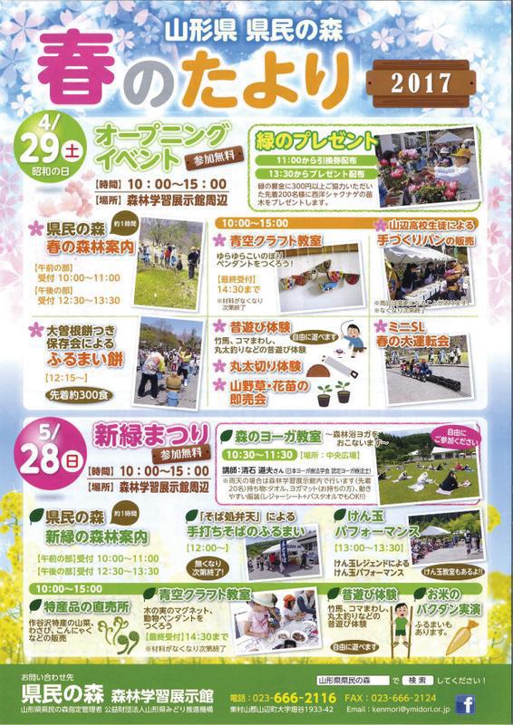 県民の森から春のたよりが届きました♪冬期閉鎖していた県民の森がいよいよオープンします。ゴールデンウィークは、新緑がまぶしい県民の森に遊びにきませんか!! ▼オープニングイベント □日 時 2017年4月29日(土・昭和の日) □場 所 県民の森森林学習展示館周辺 □時 間 10:00〜15:00 □イベント内容 ・緑のプレゼント(緑の募金300円以上ご協力いただいた方先着200名) ・春の森林案内 ・大曽根餅つき保存会ふるまい餅 ・青空クラフト教室 ・昔遊び体験・丸太切り体験・山野草・花苗の即売会 ・山辺高校生徒手づくりパンの販売 ・ミニSL春の大運転会□お問合せ先 県民の森森林学習展示館 [TEL]023−666−2116 また、5月28日(日)は『新緑まつり』が開かれます。こちらも楽しいイベントが満載です。