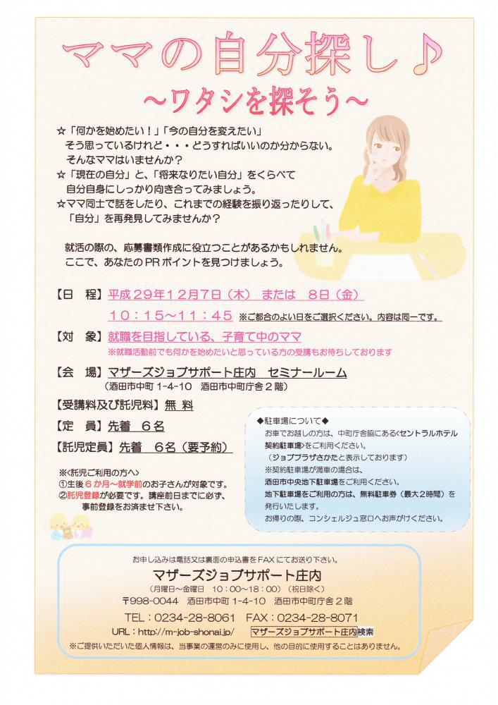 『そろそろ何か始めたい』『今の私にできることは何かな?』『今の自分を変えるにはどうしたらいいの?』そんなママにオススメします。「自分の好きなこと」「得意なこと」「これまでの経験からできること」を振り返り自分自身と向き合ったり、ママ同士でお話をしながら、"これから"を考えるキッカケにしてみませんか? 【日 時】12月7日(木)または8日(金) ※好きな日にちをお選びください。内容は同じです。【対 象】就職を目指している子育て中のママ ※就職活動前で何かを始めたい方でもOK【会 場】マザーズジョブサポート庄内 セミナールーム【受講料・託児料】無料【定員】先着6名【託児定員】先着6名※事前登録・予約が必要です。【駐車場について】 お車でお越しの際は、中町庁舎脇にある 〈セントラルホテル契約駐車場〉をご利用ください。 (ジョブプラザさかたと表示してあります。) ※契約駐車場が満車の場合は、 酒田市中央地下駐車場をご利用ください。 地下駐車場をご利用の方は、無料駐車券(最大2時間)を 発行いたします。 お帰りの際に、コンシェルジュ窓口へお声がけください。 ◇お申込み・お問い合わせ◇マザーズジョブサポート庄内TEL:0234-28-8061