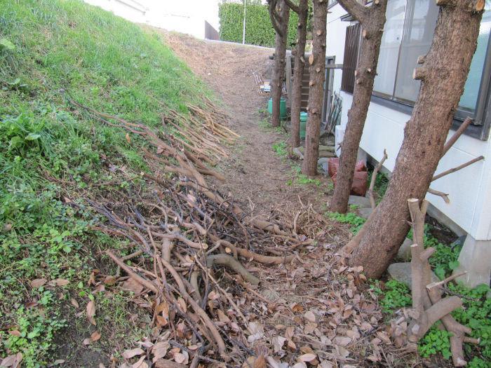 剪定作業もだいぶ進みました。こんな感じまできれいになりました。あとはこの枝(というよりは丸太)を短く切る作業です。奥の方に広葉樹を伐採したときの枯れ葉がいっぱいあります。伐採したときは緑の葉がいっぱい茂っている状況でしたが、すっかり落ちてしまいました。