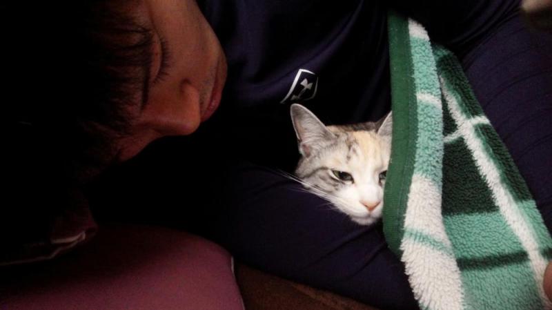 デッカイ兄ちゃんに、無理やり羽交い締めにされ、添い寝させられてるにこちゃん、超めいわくそーな顔して助けを求めています(笑)