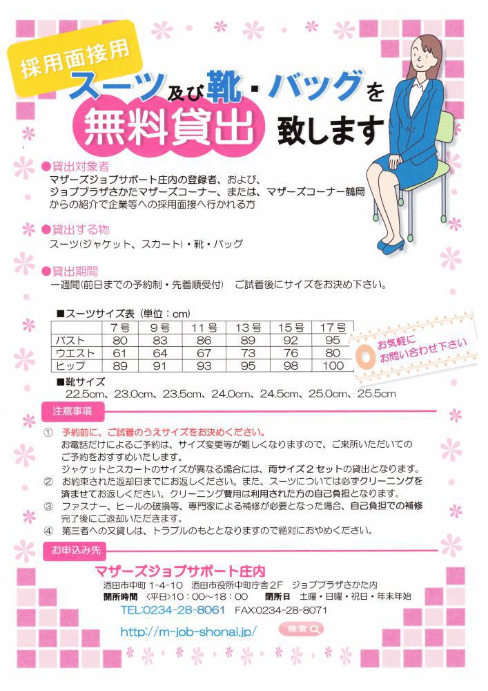 マザーズジョブサポート庄内では採用面接用のスーツ・バック・靴の無料貸出を行います。●貸出対象者 マザーズジョブサポート庄内の登録者、および、 ジョブプラザさかたマザーズコーナー、または、 マザーズコーナー鶴岡からの紹介で 採用面接へ行かれる方●貸出する物 スーツ(ジャケット・スカート)、靴、バック●貸出期間 一週間(前日までの予約制・先着順受付) ※ご試着後にサイズをお決めいただきます。【注意事項】@ 予約前に、ご試着のうえサイズをお決めください。 ※お電話だけによるご予約は、サイズ変更等が難しくなりますので ご来所いただいてのご予約をおすすめいたします。 ※ジャケットとスカートのサイズが異なる場合には 両サイズ2セットの貸出しとなります。A お約束された返却日までにお返しください。 なお、スーツについては必ずクリーニングを済ませてお返しください。 ※クリーニング費用は利用された方の自己負担となります。B ファスナー、ヒールの破損等、専門家による補修が必要と なった場合、自己負担での補修完了後にご返却いただきます。C 第三者への又貸しは、トラブルのもととなりますので 絶対におやめください。 ☆彡 ご利用をお考えの方は、お気軽に 『マザーズジョブサポート庄内』まで ご連絡ください。 ☆彡 【駐車場について】 お車でお越しの際は、中町庁舎脇にある 〈セントラルホテル契約駐車場〉をご利用ください。 (ジョブプラザさかたと表示してあります。) ※契約駐車場が満車の場合は、 酒田市中央地下駐車場をご利用ください。 地下駐車場をご利用の方は、無料駐車券(最大2時間)を 発行いたします。 お帰りの際に、コンシェルジュ窓口へお声がけください。 ◇お申込み・お問い合わせ◇ マザーズジョブサポート庄内 TEL:0234-28-8061