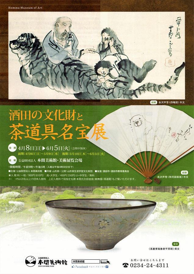 新年度最初の展覧会「酒田の文化財と茶道具名宝展」が始まりました。 北前船の寄港地として栄えた酒田には、全国各地から流行物や美術品が伝わっています。そうした地域性から、江戸期以降も美術や歴史に対する嗜好は強く、数多くの美術品や史料が先人たちの熱意によって伝来されてきました。その中でも、特に貴重な品は国や県、酒田市の指定文化財となっています。 展覧会場一階では、本間美術館が所蔵する国・県・市指定文化財を展示しています。展覧会は前期と後期に分かれており、絵画と書は全て入れ替わります。 重要美術品 紺帋金銀字金剛頂説文殊五字勝相 平安時代(12世紀) 県指定文化財 魚籃観音花鳥図 章経 15〜16世紀 県指定文化財 蕪村自筆句稿貼交屏風 呉春画 江戸時代中期(18世紀) 市指定文化財 高麗青磁蒲柳水禽文浄瓶 高麗時代(14世紀) 「学芸員おすすめの逸品」という特別コーナーを設けました。指定文化財ではありませんが、皆さんにぜひご覧いただきたい、美しく、珍しく、面白い作品をご紹介します。こちらは前期と後期で全て入れ替わります。 太刀 無銘(月山) 室町時代(15世紀) 高麗青磁瓜形水注 高麗時代(14世紀) 柿右衛門 色絵鳳凰草花文八角鉢 江戸時代前期(17世紀) また、藩主酒井侯がお茶に傾倒していたことや、隣県の秋田から玉川遠州流が伝授されたことにより、酒田では古くから茶道が盛んでした。文化財には、藩主や茶人たちが珍重した茶道具や茶掛物も多く見られます。 二階展示室では、指定文化財を含む、本間家ゆかりの茶道具名品を展示しています。 本展では、当館が所蔵する貴重な指定文化財と、本間家が藩主より拝領した茶道具の名品をご紹介します。日本遺産『荒波を越えた男たちの夢が紡いだ異空間〜北前船寄港地・船主集落〜』の構成文化財でもある「鶴舞園」と共に、酒田の文化と歴史、日本をはじめとする東洋美術の粋をお楽しみ下さい。 ※前期展:4月8日〜5月9日 / 後期展:5月10日〜6月5日