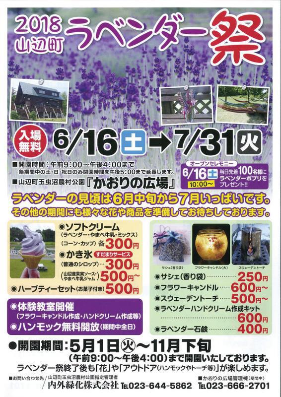 6月16日(土)より、いよいよ山辺町ラベンダー祭が始まります(^o^)/現在、玉虫沼農村公園「かおりの広場」のラベンダーは祭に向けてぐんぐんと成長中です。ラベンダーの他にも様々な花を楽しむことができます。ラベンダー祭期間中は、大人気の“ラベンダーソフトクリーム”や山辺町ご当地かき氷の“すだまり氷”や、ラベンダー関連グッズ等も多数販売します。また、フラワーキャンドル等の体験教室も開催しています。6月16日(土)のオープニングセレモニーでは、先着100名様にラベンダーポプリをプレゼントします。ラベンダーの香りに包まれた癒しの空間「かおりの広場」に遊びに来ませんか!! 2018山辺町『ラベンダー祭』□開催期間 2018年6月16日(土)〜7月31日(火)□開催場所 山辺町玉虫沼農村公園『かおりの広場』□開催時間 午前9時〜午後4時 祭期間中の土・日・祝日は午後5時まで□お問合せ先 内外緑化株式会社 【TEL】023−644−5862